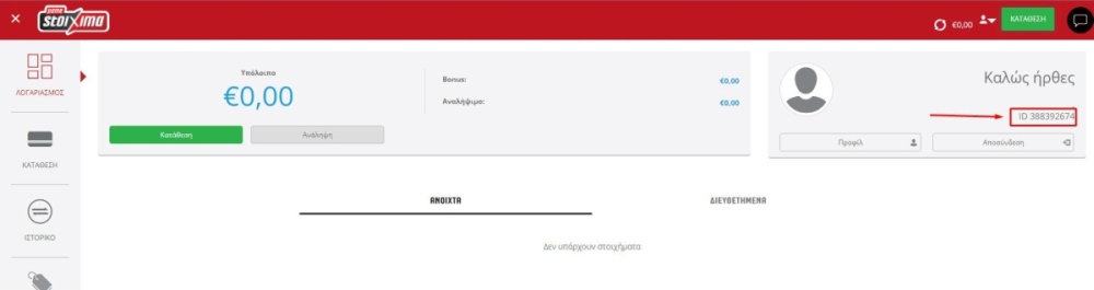 Εναλλακτικά, το pamestoixima σας δίνει τη δυνατότητα να κάνετε ταυτοποίηση με τη χρήση του IBAN λογαριασμού σας. Η καινοτομία δε της Allwyn, είναι πως μπορείτε να κάνετε τη διαδικασία και σε κάποιο επίγειο πρακτορείο. Αρκεί να γνωρίζεται το μοναδικό «User ID» σας. Πρόκειται για τα εννιά ψηφία που βρίσκονται στην ενότητα «Λογαριασμός» πάνω δεξιά.