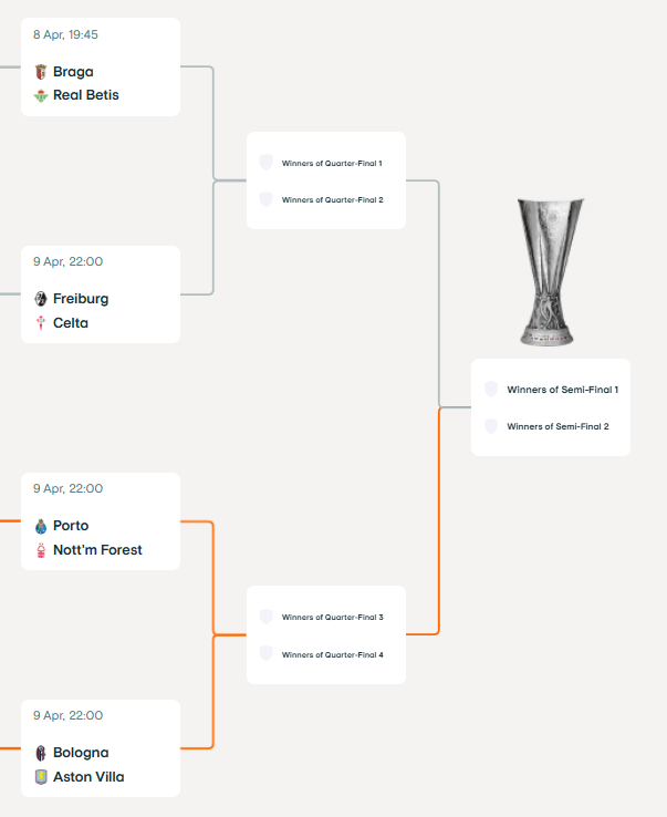 Όποια ομάδα περάσει θα βρει απέναντί της τον νικητή του ζευγαριού Φράιμπουργκ - Θέλτα. Από την άλλη πλευρά η Πόρτο θα αντιμετωπίσει τη Νότιγχαμ Φόρεστ, ενώ η Μπολόνια που πήρε τον ιταλικό «εμφύλιο» απέναντι στην Ρόμα, θα παίξει κόντρα στο φαβορί για την κούπα, την Άστον Βίλα.