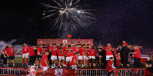 Ακολούθησε η απονομή του τροπαίου στους πρωταθλητές που συνοδεύτηκε από ένα εντυπωσιακό σόου με πυροτεχνήματα και στη συνέχεια οι παίκτες με το κύπελλο στα χέρια τους έκαναν το γύρο του θριάμβου στο Δημοτικό γήπεδο Σερρών.