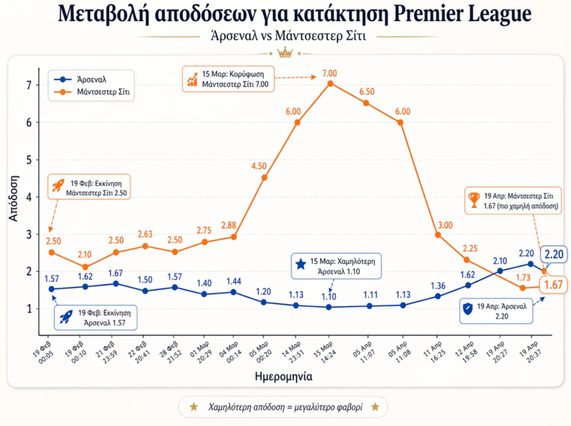 Η αλλαγή στην αγορά ήταν εντυπωσιακή! Από το 7.00, η Μάντσεστερ Σίτι πλέον προσφέρεται περίπου στο 1.67 για την κατάκτηση του τίτλου, επιβεβαιώνοντας τη δυναμική της στο πιο καθοριστικό σημείο της σεζόν.