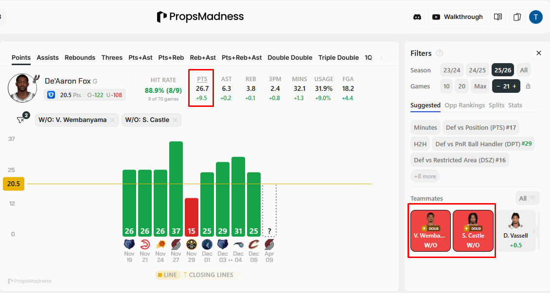 Ο Fox σε 9 ματς χωρίς Wemby και Castle έχει 26.7π. ΜΟ, ενώ ξεπερνάει το όριο των 20.5 πόντων, σε 8 από αυτά τα 9 ματς. Κι όχι απλώς ξεπερνάει το όριο των 20.5π. "γράφει" 8/9 Over 24.5π. Κοινώς, αν κάποιος θέλει να ρισκάρει με μεγαλύτερο όριο, μπορεί. Αξίζει να σημειώσουμε ότι στις 27/11 έπαιξαν πάλι οι Spurs, με Fox και χωρίς Wemby & Castle και είχε 37π. ο guard των Spurs.