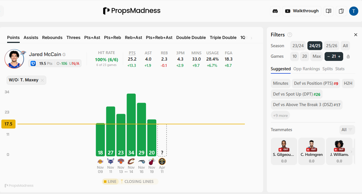 Αλλά το βασικό είναι η περσινή του εικόνα στη Philadelphia (όπως δείχνει και η εικόνα), στα ματς όμως που κλήθηκε να καλύψει το κενό του Maxey. Εκεί προς το ξεκίνημα της σεζόν, που ο Tyrese ήταν τραυματίας. Ο McCain λοιπόν ήταν η αποκάλυψη των 76ers και πολλοί έκαναν λόγο για τον rookie της σεζόν. Τραυματίστηκε μετά και έμεινε εκτός για όλη τη σεζόν. Σε εκείνο το διάστημα όμως, ο McCain ήταν εξαιρετικός. Πήγε και στα 6 ματς πάνω από τους 17π., με 25.2π. ΜΟ. Είχε 28.4% USG, με 18.3 FGA.