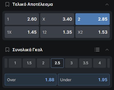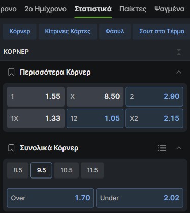 Οι αγορές επικεντρώνονται σε αυτά που πραγματικά μετράνε: βασικές αγορές (Συνολικά γκολ, GG/NG, συνολικά γκολ ομάδας), 1ο ημίχρονο (1X2), και στατιστικά αγώνα. Κάθε επιλογή «κουμπώνει» φυσικά με την επόμενη, δημιουργώντας ένα πιο έξυπνο, στρατηγικό Bet Builder* που δουλεύει υπέρ σου και όχι εις βάρος σου.