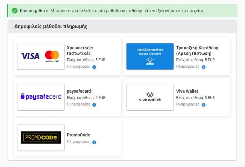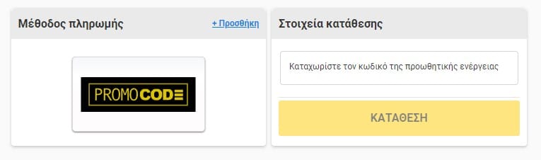 Βήμα 5: Στο επόμενο στάδιο σου παρουσιάζονται όλες οι διαθέσιμες μέθοδοι κατάθεσης, από τις οποίες διαλέγεις το «PROMO CODE».